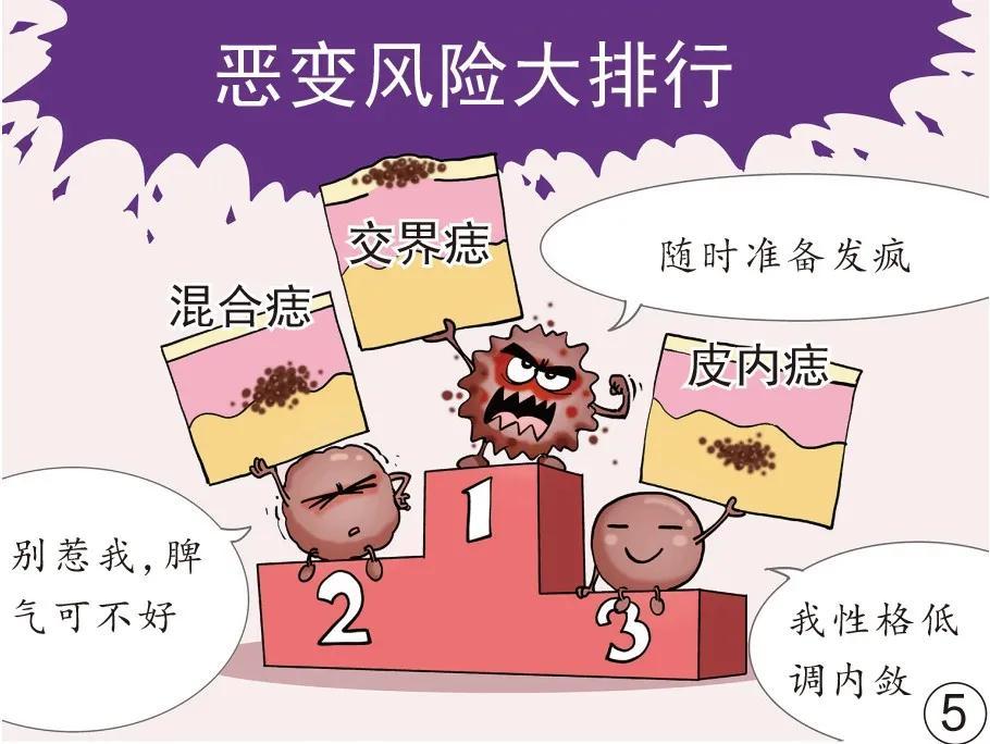 從位置上看,痣大體分爲皮內痣、交界痣、混合痣三類,發展爲黑色素瘤的危險性從小到大依次爲皮內痣、混合痣、交界痣。