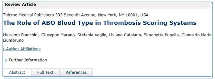 [3]Massimo Franchini,Giuseppe Marano,Stefania Vaglio,Liviana Catalano,Simonetta Pupella,Giancarlo Maria Liumbruno.The Role of ABO Blood Type in Thrombosis Scoring Systems.Semin Thromb Hemost.2017.03