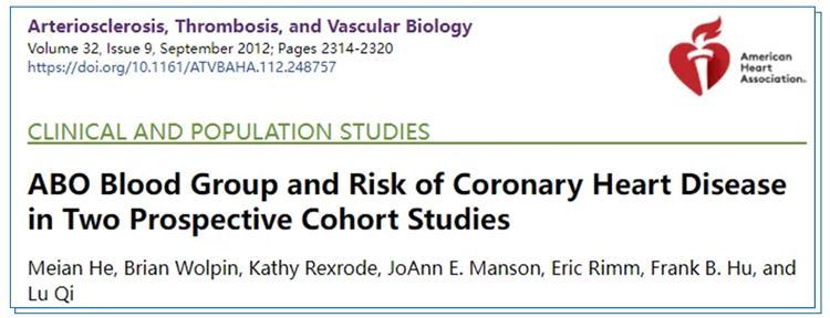 [5]Meian He, Brian Wolpin, Kathy Rexrode, JoAnn E. Manson, Eric Rimm,Frank B.Hu,and Lu Qi.ABO Blood Group and Risk of Coronary Heart Disease