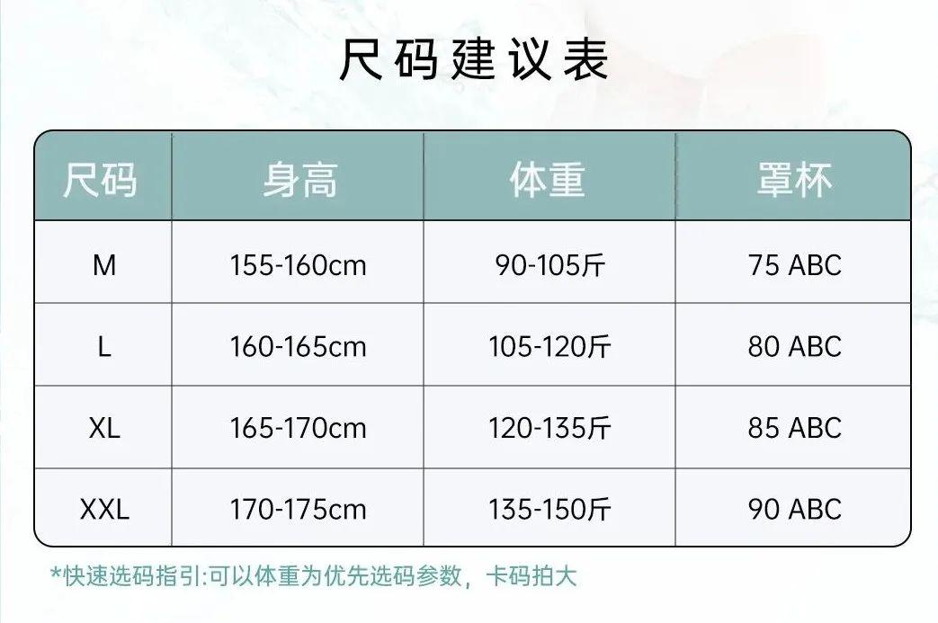 每個顏色,還分 5 個尺碼,80~150 斤 D 杯及以下都能穿(想給家裏的小女孩買的話,這款也很合適喲)。