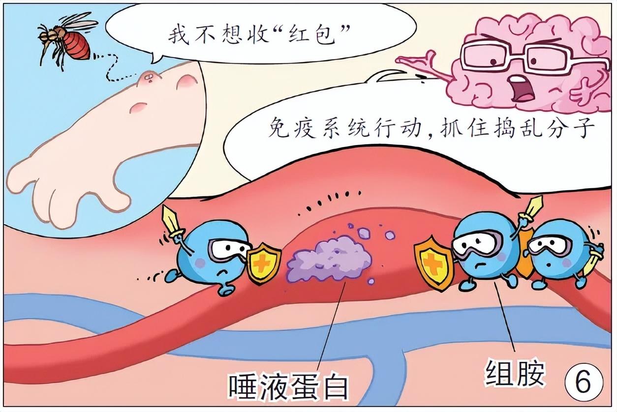 人體免疫系統被迅速調動起來,唾液蛋白被皮膚下的肥大細胞識別爲“敵人”,肥大細胞釋放大量組胺,導致局部毛細血管擴張,血漿滲出到皮膚組織,形成紅腫包塊,組胺激活皮膚神經末梢,導致人產生瘙癢感。