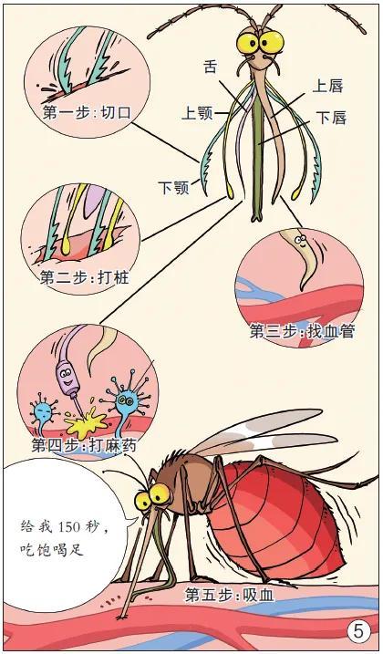 雌蚊的口器由上顎、下顎、上脣、下脣、舌等“利器”組成,它會先用最外側鋸齒狀的下顎切開皮膚。