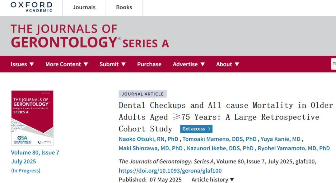 近期,日本大阪公立大學護理研究生院在美國《老年學雜誌:醫學科學(老年學雜誌A輯)》上在線發表的牙科領域全球最大規模流行病學研究表明,沒有定期接受口腔檢查的老年人死亡風險會大幅上升。