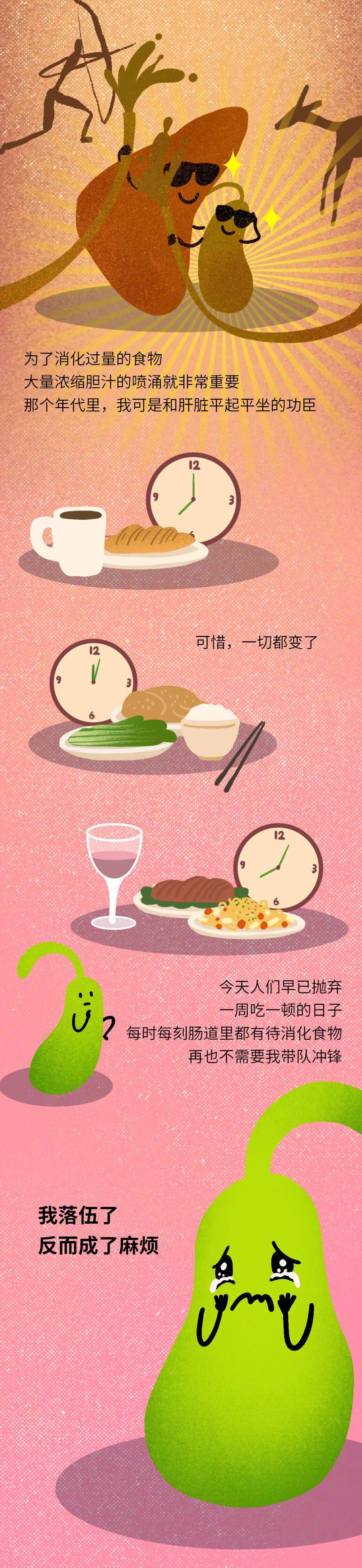 這不是膽囊的錯,只是時代的發展,遠遠超過了生物體的進化速度。曾經是主角的膽囊、胃等器官在今天都離開了舞臺中央,帶來的麻煩可能比正面價值都大。