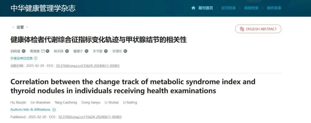 研究指出,健康體檢者代謝綜合徵指標變化軌跡與甲狀腺結節呈正相關,代謝綜合徵指標可作爲甲狀腺結節的預測指標。