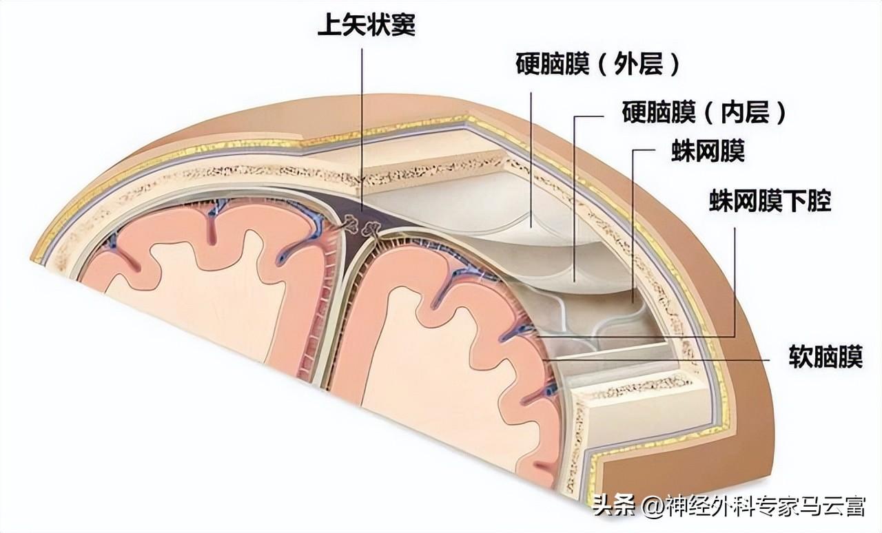 這兩層膜之間,有個平時空空的 “夾縫”,叫 硬膜下腔 。要是這裏的血管不小心破了,血液會慢慢滲進夾縫裏,越積越多,最後變成一灘 “血包”—— 這就是 硬膜下血腫!