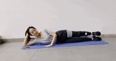 面向右側躺下,將左腿向上方抬起20釐米,堅持5秒放下,換另一側。