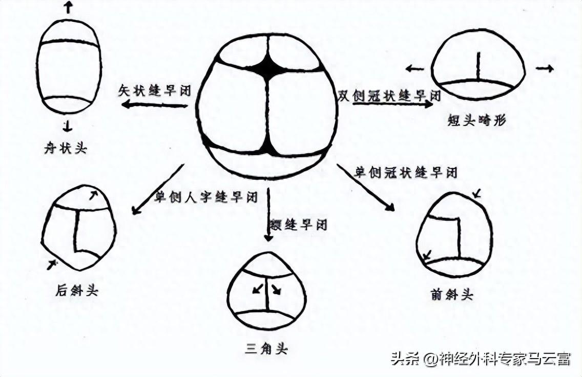“方塊頭”(短頭): 額頭寬得有些突兀,後腦勺也平平的,整個頭型方方正正,少了幾分嬰兒的柔和。這通常是雙側冠狀縫過早閉合,限制了顱骨向前後方向的生長。