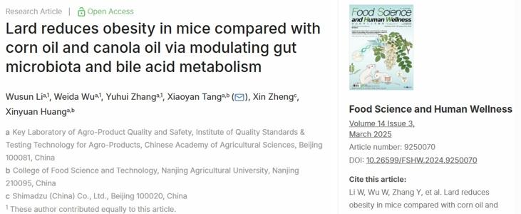 《食品科學與人類健康》上發表的一項由我國農業科學院等研究機構進行的研究指出,攝入豬油的實驗小鼠相較於攝入玉米油、菜籽油的身材更爲苗條。
