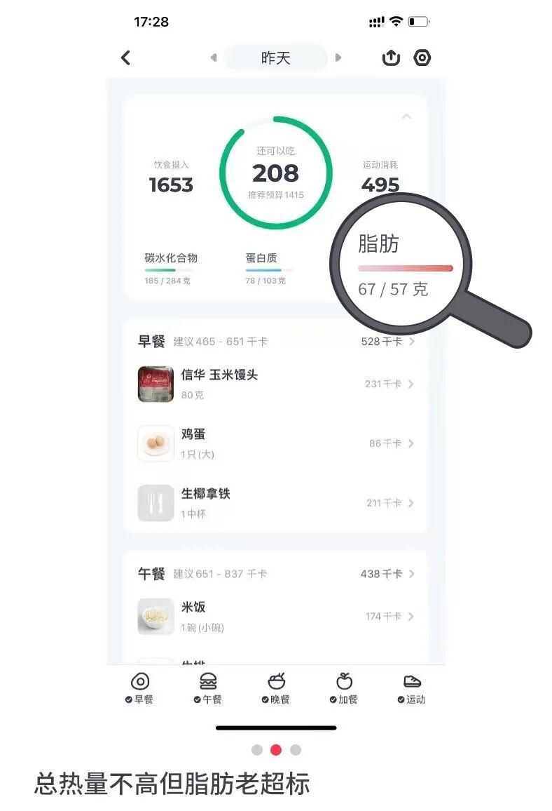 不信你可以下載個飲食記錄工具,記兩天就會發現,碳水和蛋白質總喫不夠,而脂肪,哪怕已經喫得很剋制,也容易爆表。