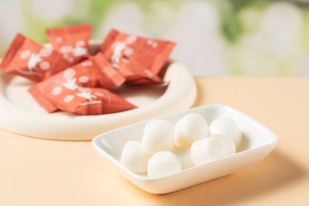 我們的鈣軟糖外觀就像是乳白色的牛奶糖,捏起來 Q 彈軟糯,味道香甜可口不廢牙,隨時隨地來一兩粒毫無負擔補充鈣營養。