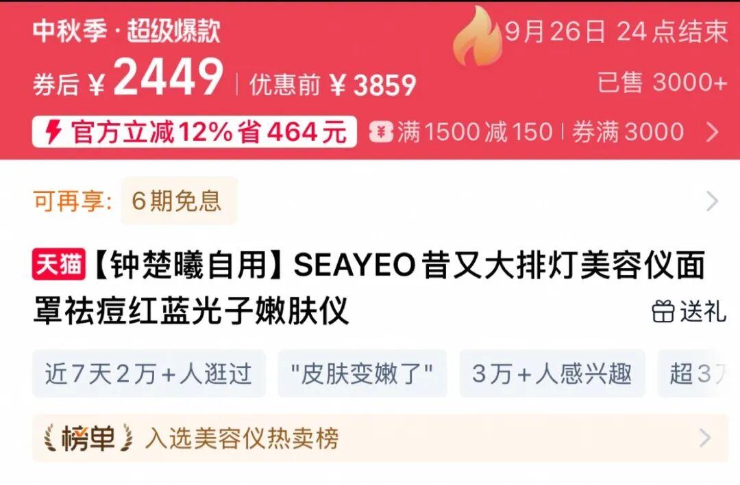 官方旗艦店原價 3859,等大促也要 2449 的 seayeo 大排燈美容儀: