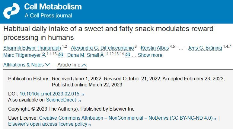 權威雜誌Cell子刊曾發佈過這樣一篇研究,通過對照49個正常體重的參與者,在接觸高糖高脂食物後,大腦的反應情況,發現大腦會自動激活多巴胺能系統,改變獎賞迴路,下意識的學會偏好此類食品,同時降低對低脂食品的偏好,說明高糖高脂食品確實可以影響神經行爲,導致越喫越上癮,並增加肥胖風險。