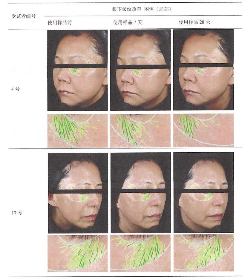 來看 31 名受試者在使用產品 28 天后眼下皺紋改善的情況,之前細細密密的皺紋,少得都快能數得過來了。
