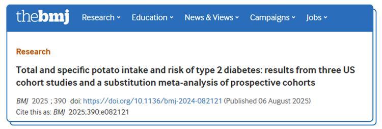 [1] Mousavi S M, Gu X, Imamura F, et al. Total and specific potato intake and risk of type 2 diabetes: results from three US cohort studies and a substitution meta-analysis of prospective cohorts[J]. bmj, 2025, 390.
