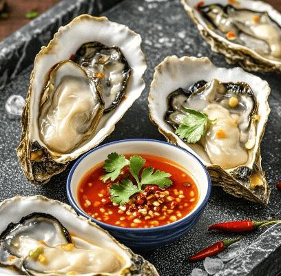 生蠔配蘸料、醋溜魚片兒、海鮮什錦、白切牛肉蘸料汁兒……