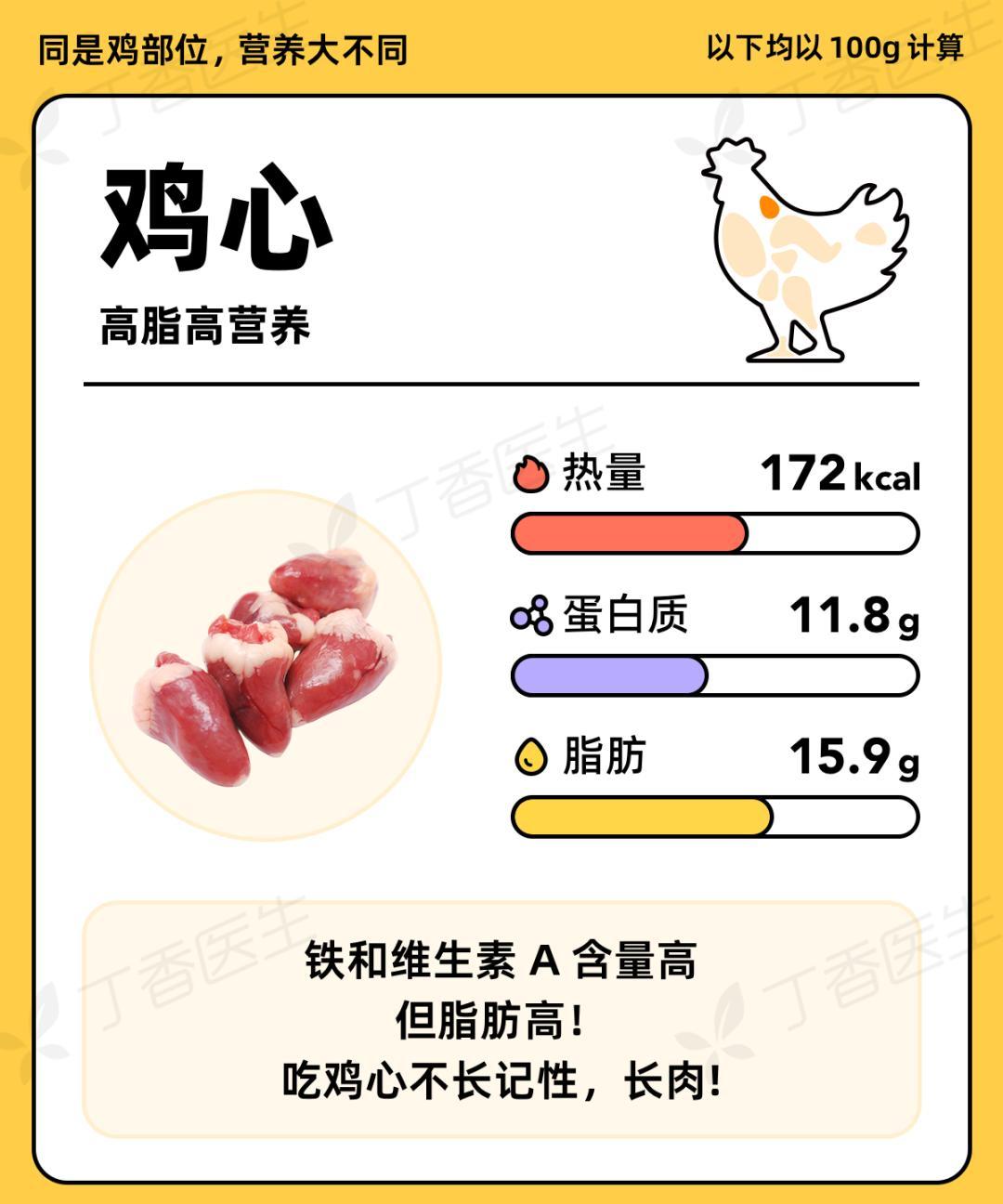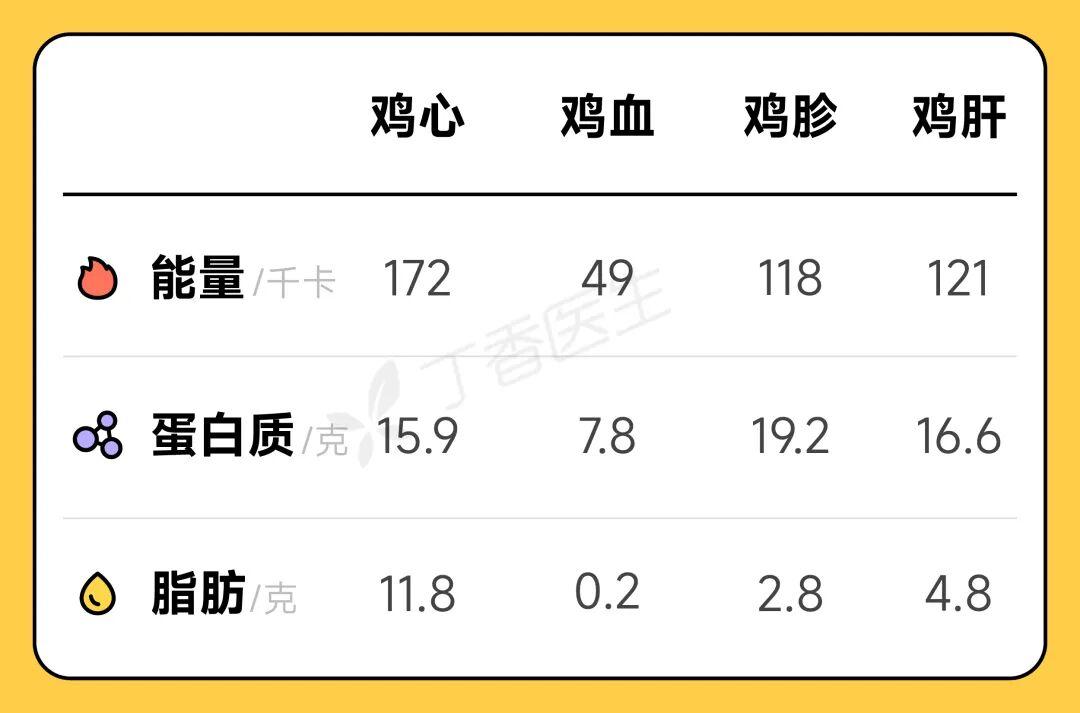 內臟裏能量最高的就是雞心,雞心的能量是雞血的 3.5 倍,這個能量不僅在動物內臟裏出類拔萃,比雞胸脯肉和雞腿的能量也高了不少。