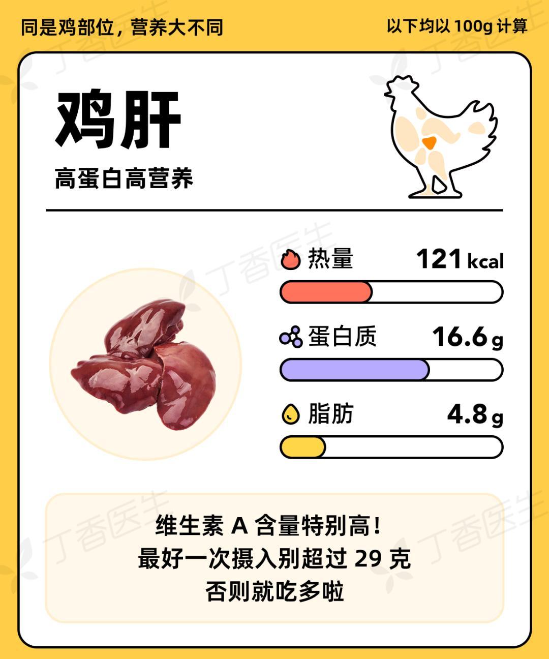 但雞肝的維生素 A 含量超高,喫 7~8 克就能滿足白領一族每日維生素 A 的需求,如果不考慮維生素 A 的其它食物來源,那喫 28 克雞肝攝入的維生素 A 就會達到每日最高可耐受攝入量,所以喫雞肝時控制在 25 克以內更安全。