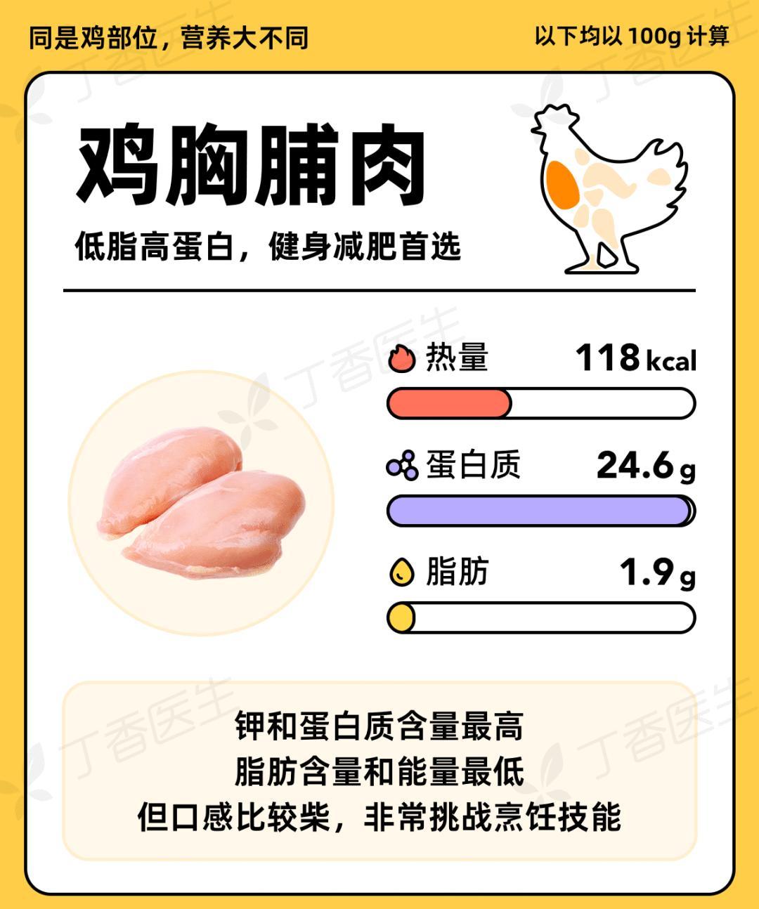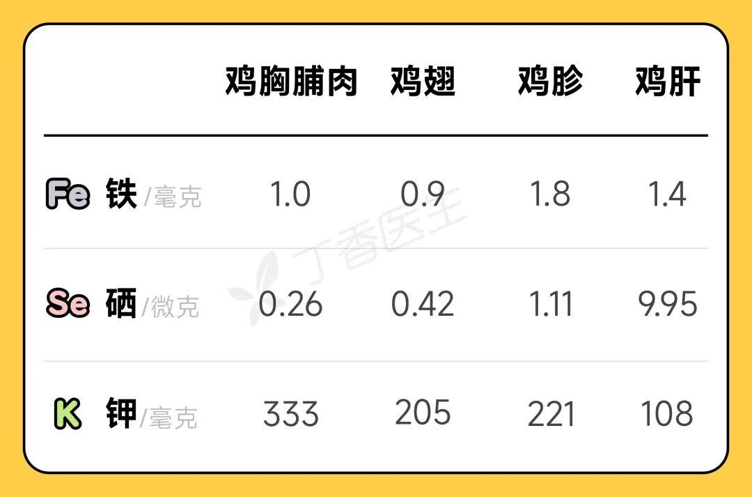另外,雞胸脯肉的鉀含量也不低,它的鉀含量是雞腿的 1.5 倍,雞翅的 1.6 倍、雞爪的3.1倍。這個鉀含量不僅是比雞腿高,還是整隻雞身上含量最高的。