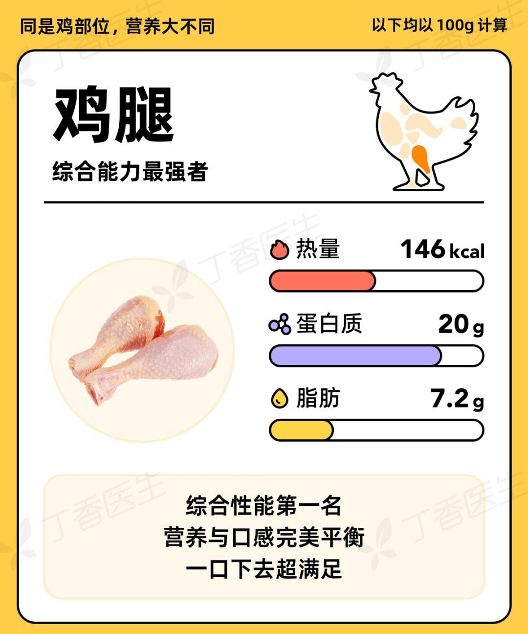 如果加上口感這點評分標準,雞腿的優秀就出來了!同等對比雞胸脯肉和雞翅,雞腿肉的蛋白質含量並不低,只比雞胸脯肉少了 18%。