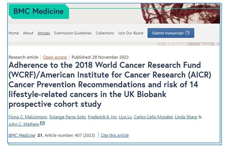 [1]Fiona C.Malcomson,Solange Parra-Soto,Frederick K.Ho,Liya Lu,Carlos Celis-Morales, Linda Sharp & John C. Mathers.Adherence to the 2018 World Cancer Research Fund (WCRF)/American Institute for Cancer Research (AICR) Cancer Prevention Recommendations and cancer risk:A systematic review and meta-analysis.BMC Medicine volume 21, Article number: 407 (2023)