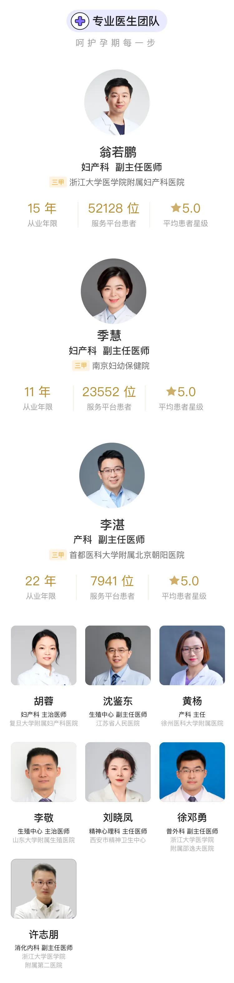 當前服務好孕卡的醫生共計 10 位,來自全國知名公立三甲醫院醫生。好孕卡優惠券適用於醫生團隊的圖文問診服務。