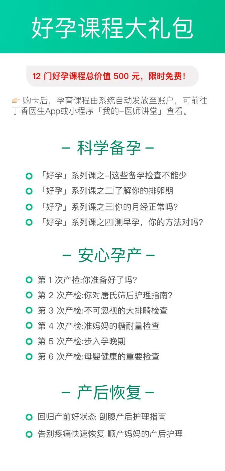 您只需要點擊下方圖片-我要購買-填寫手機號-立即支付,即可享受丁香醫生「好孕卡」首發限時優惠。