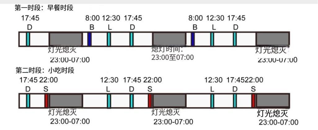 ● 時段二:不喫早餐,其他兩餐在飯點正常時間喫,在晚上 10 點喫與早餐同樣 700 千卡食物作爲夜宵小喫。