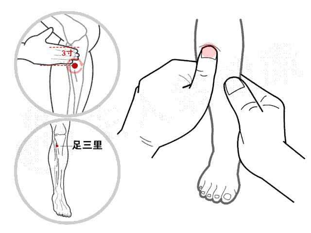配合按揉足三里穴(小腿前外側,外膝眼下四橫指處),足三里是足陽明胃經的重要穴位之一,每日按揉5~10分鐘,可調理脾胃。