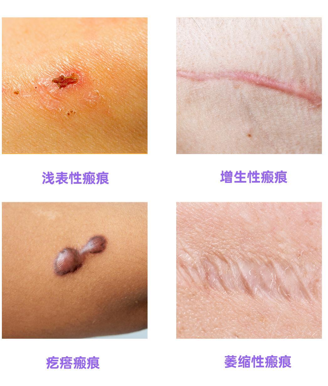 淺表性疤痕、增生性疤痕、疤痕疙瘩、萎縮性疤痕。