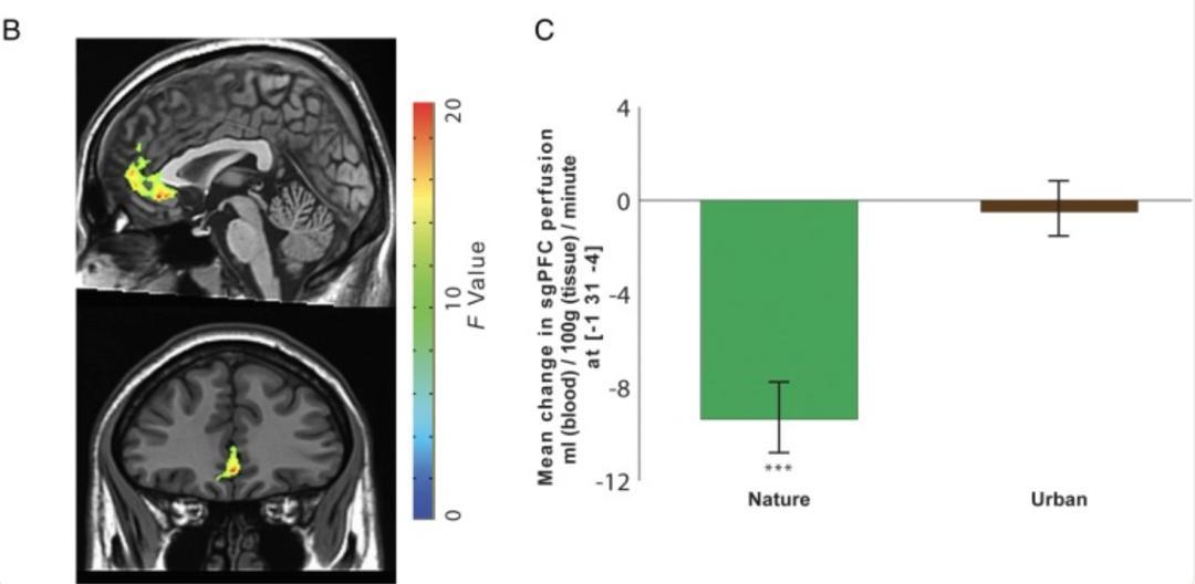 反芻思維減少,與反芻思維相關的膝下前額葉皮質 (sgPFC) 活動降低,而城市環境散步則沒有發現這類影響。[7]