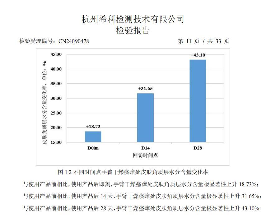 實驗顯示,參與的受試者在經過 28 天試用後,角質層水分含量提升 43.1%,皮膚光滑度提升 23.11%,受試者自評皮膚瘙癢感和泛紅均下降。