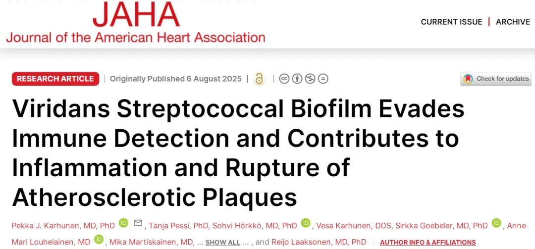 芬蘭研究人員在《美國心臟協會雜誌》刊發一項新研究,對200多名冠狀動脈疾病患者的動脈斑塊進行檢查。結果顯示,有60%的動脈樣本中存在多種細菌的DNA,其中草綠色鏈球菌的檢出率達42%。