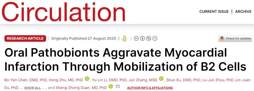 國際心血管期刊《循環》近日也刊發新研究稱,口腔致病菌和促炎B2細胞可顯著增加心肌梗死風險。