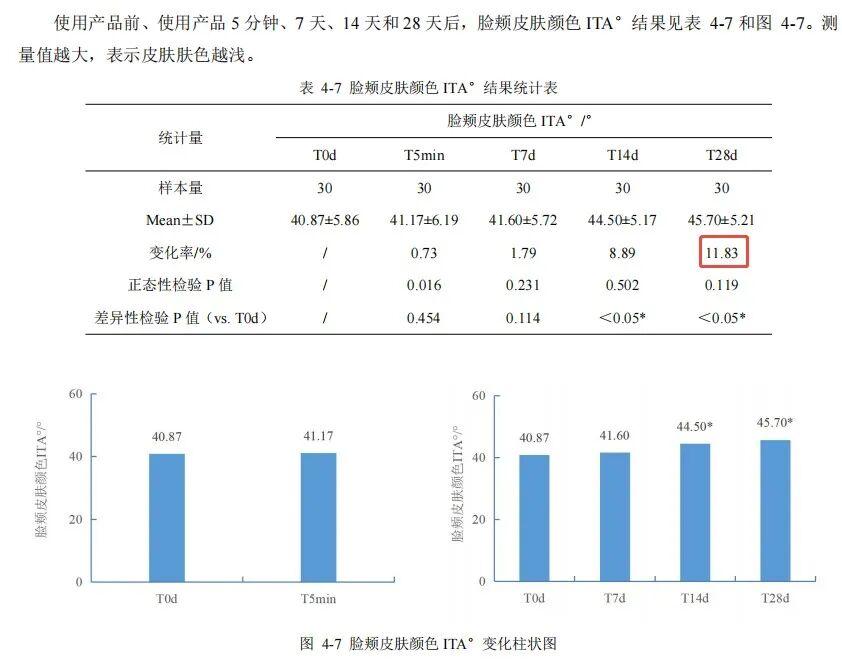 咱丁香自研這款美白精華,30 名受試者,在停用的第 29 天到 42 天中,臉頰黑色素含量