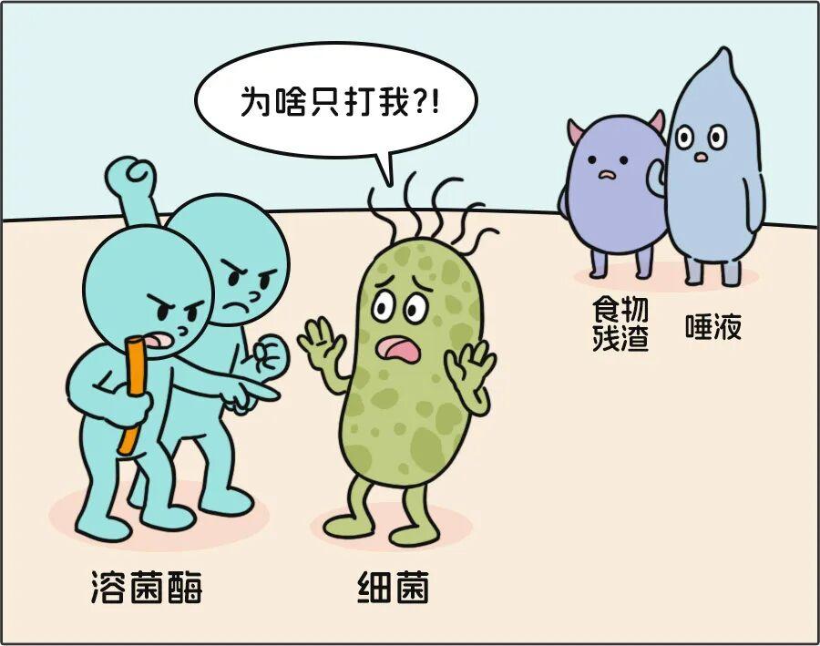 作爲口腔裏一種天然的抗菌酶,它能破壞細菌細胞壁結構,把細菌解開,讓它們沒法搞破壞,從源頭抑制牙菌斑的形成。