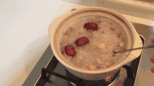 ③中火煮5分鐘後,加入山藥塊和紅棗,轉小火慢煮,其間攪拌幾次防粘底,關火前2分鐘加入枸杞;