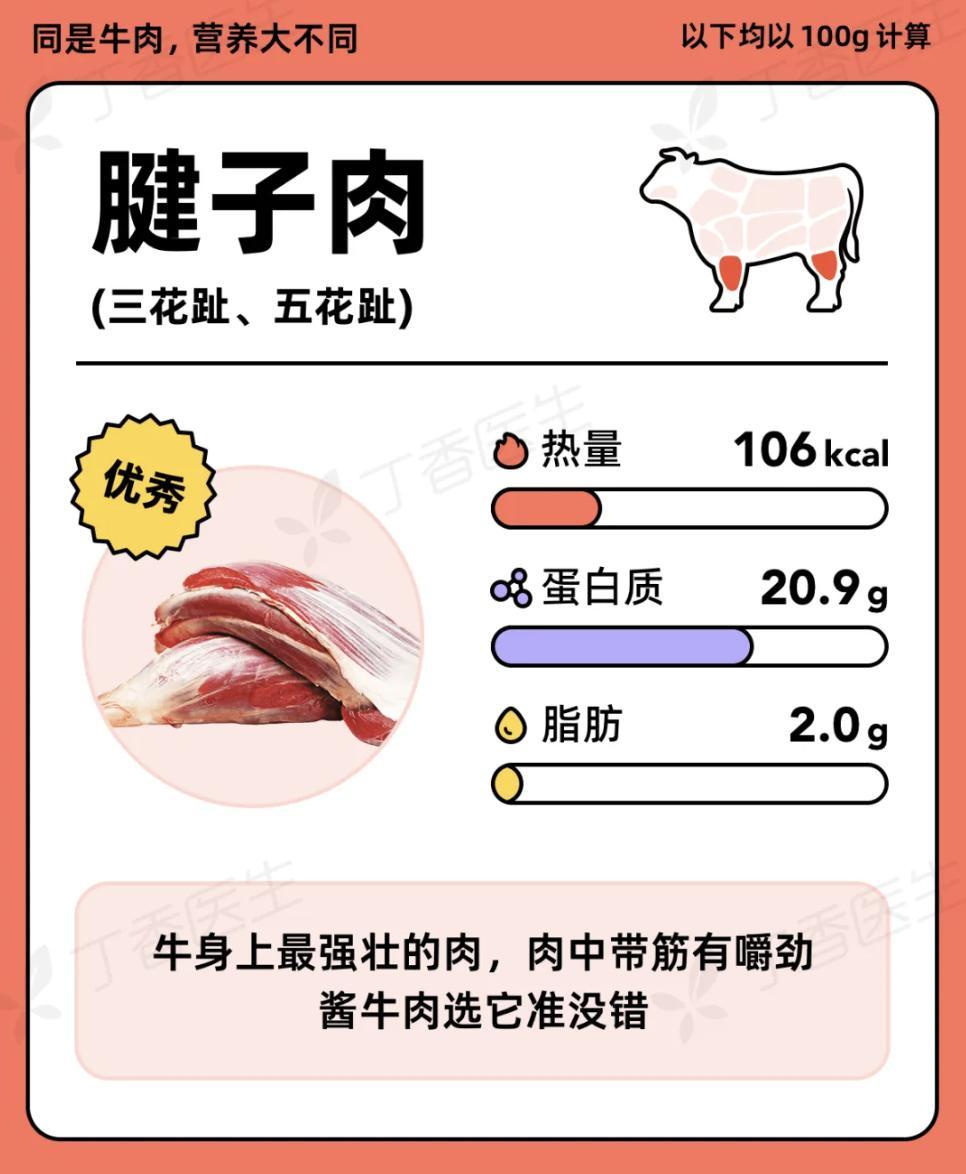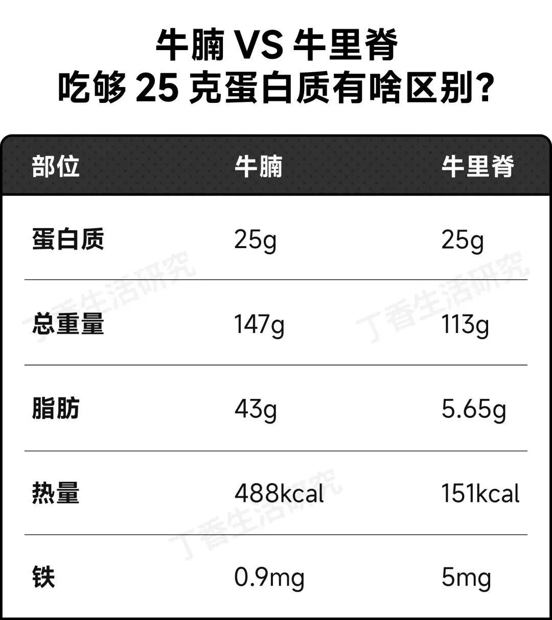這也很好理解,被油脂佔了半壁江山,蛋白質含量也會被擠壓得相應較少。就拿牛腱子來說吧,牛腩的蛋白質含量是 17.1 g/100 g,而牛腱子有 23 g/100 g,是牛腩的 1.35 倍~