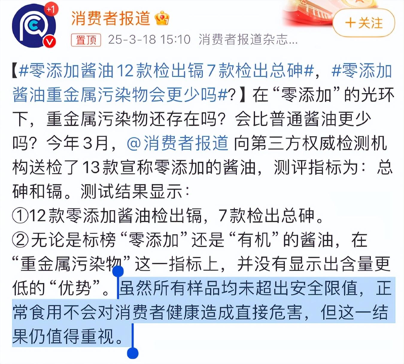 《消費者報道》的研究人員曾購買了13種號稱0添加的醬油送檢,結果有12款被檢出鎘、7款檢出總砷。