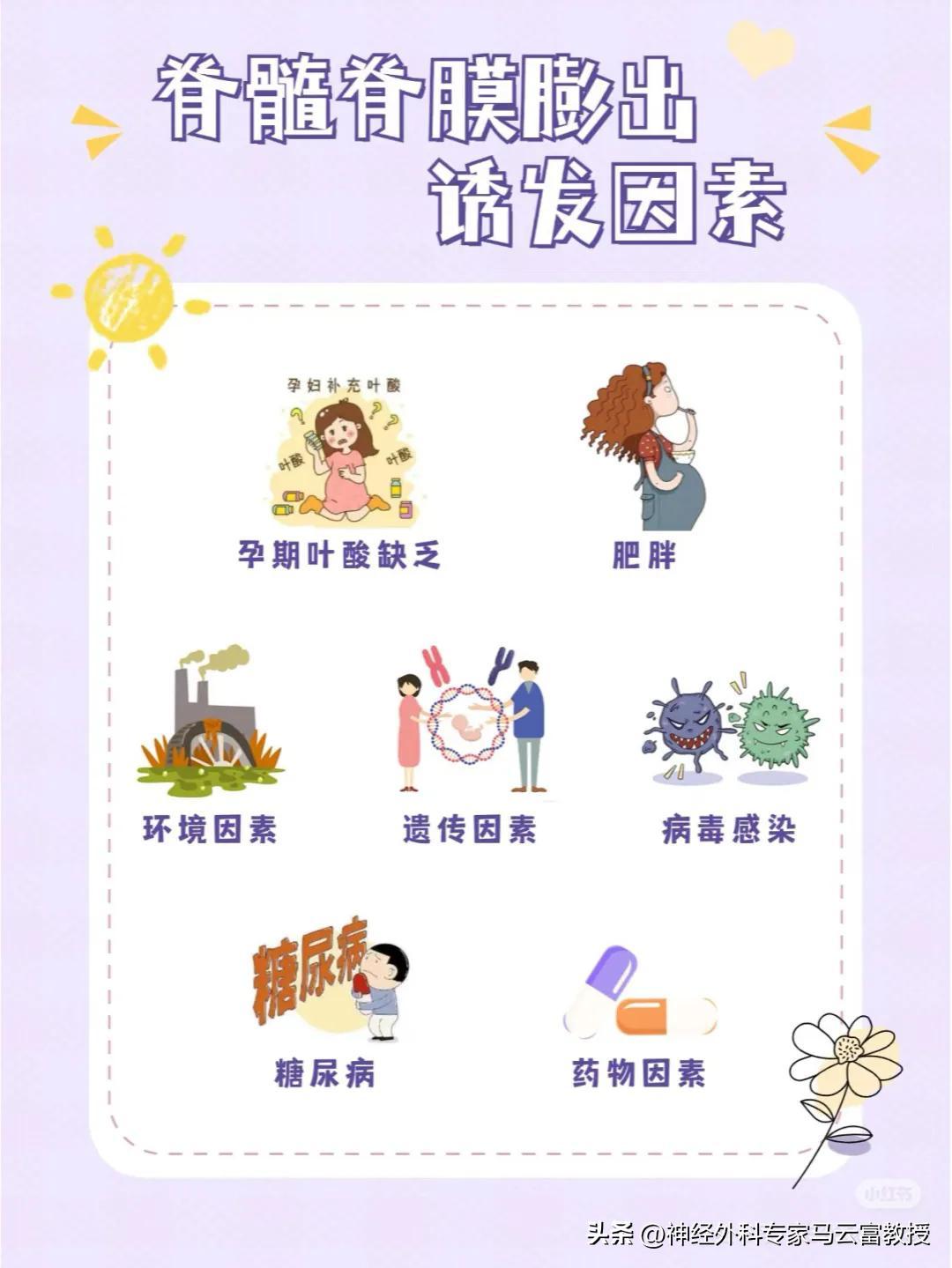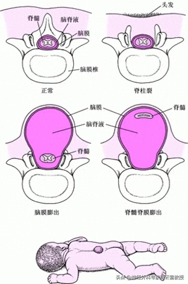 脊髓脊膜膨出是胚胎時期神經管閉合不全,使脊髓脊膜從脊柱裂隙中膨出形成囊性腫物,可導致不同程度的脊髓畸形果發育異常。
