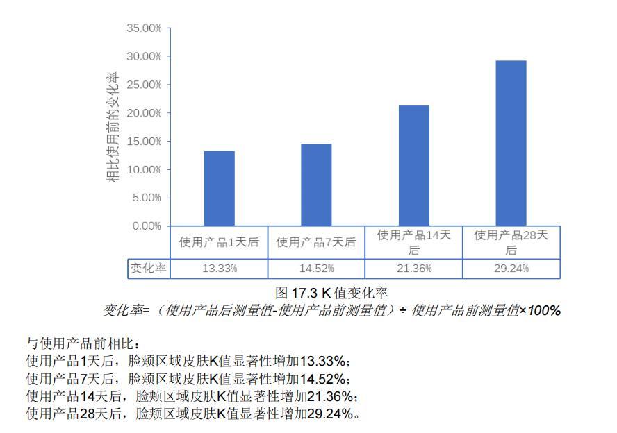 從實際數據來看,28 天后皮膚的光澤增加了 17.96%,臉頰的 K 值(半透明度)增加了 29.24%!