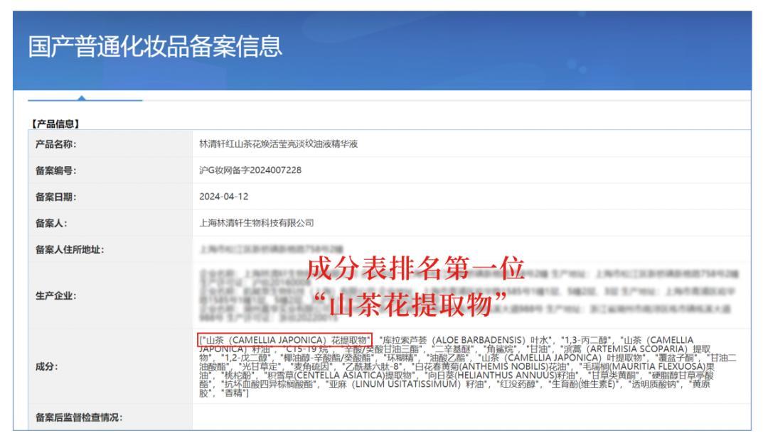看備案成分表能發現,排第一位的就是「山茶花提取物」。