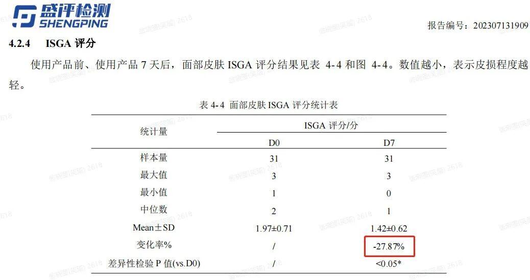 而且,除了 SGS 斑貼報告外,它還做了面部皮膚 ISGA 評分。