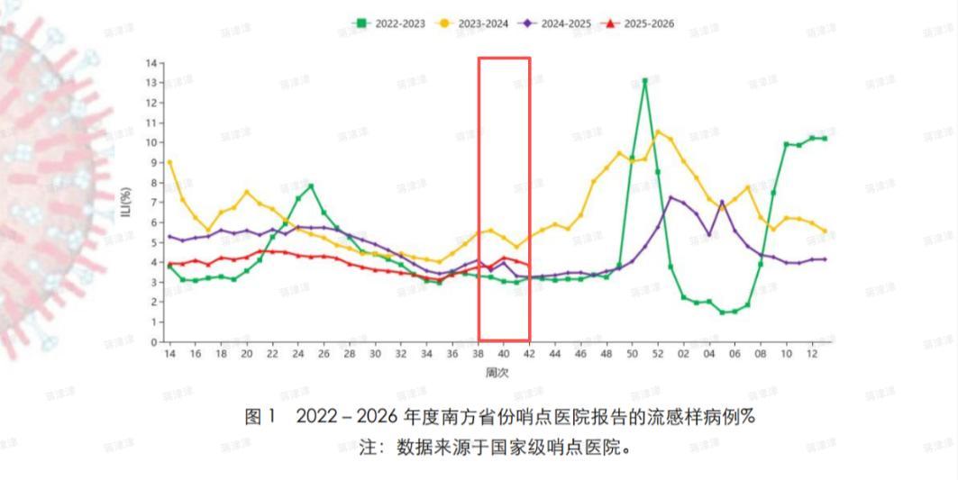 從 38 周開始,今年南方省份哨點醫院報告的流感樣病例明顯比往年高(除 23 年)。