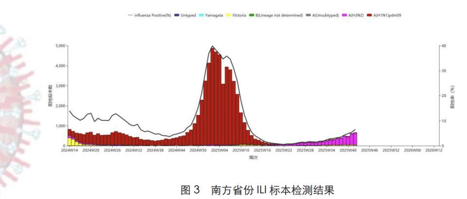 2025 年第 42 周,南方省份檢測到 663 份流感病毒陽性標本。其中 32 份爲A(H1N1)pdm09,593份爲 A(H3N2),38 份爲 B(Victoria)。