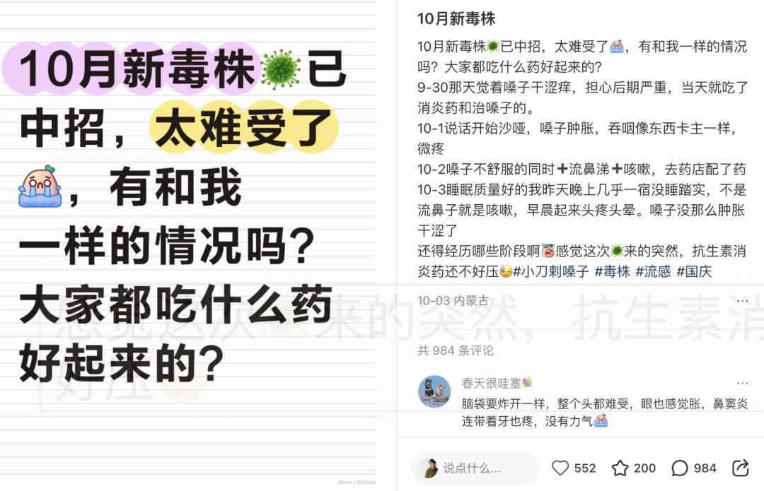 進入 10 月以來,不少人在社交平臺上發帖說,自己出現了流感相關症狀:咳嗽、發燒、頭暈、嗓子疼……