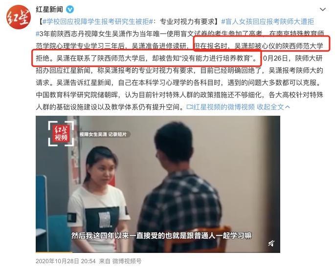 可是,她在 2020 年擬考告陝西師範大學同專業研究生時卻被拒絕,理由是「學校不具備培養盲人學生的條件」。