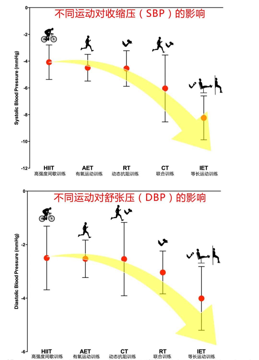 該研究分析了270項隨機對照試驗,納入了15827名參與者,通過對高強度間歇訓練、有氧運動、抗阻運動、有氧阻力聯合訓練、等長運動等分析後發現:所有類型的運動都有助於降低靜息收縮壓和舒張壓,但等長運動的降壓幅度最大。