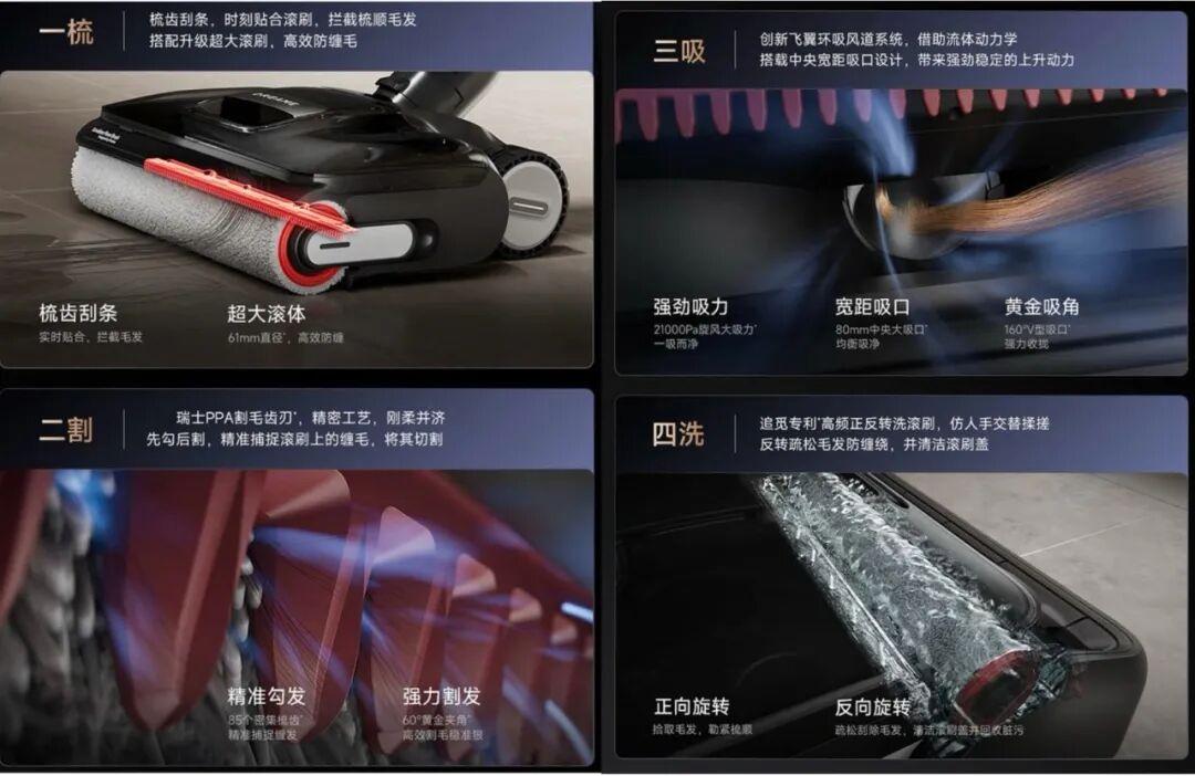 它能一梳、二割、三吸、四洗,能在工作時實時勾割纏繞的毛髮,然後吸入污水箱,實現真正的毛髮 0 纏繞,徹底解決了手動清理滾刷上毛髮的噁心體驗!