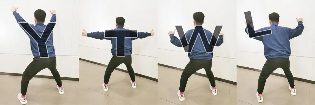Y動作主要鍛鍊下斜方肌,T動作主要鍛鍊中斜方肌、菱形肌,W動作主要鍛鍊中下斜方肌、菱形肌,L動作主要鍛鍊岡下肌、小圓肌。